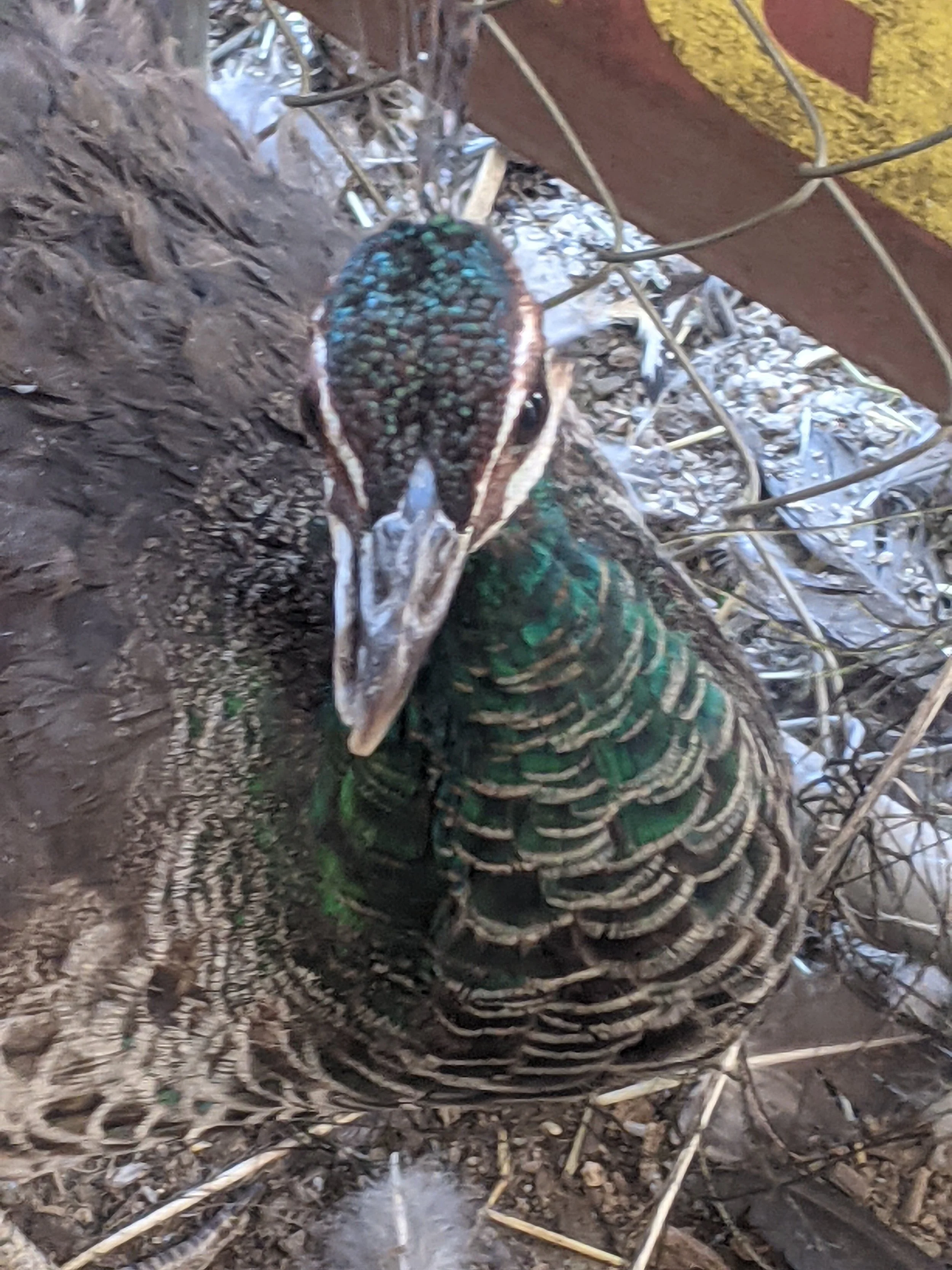 You can see one of our relocated peacocks at his new home where he was introduced to an existing flock.